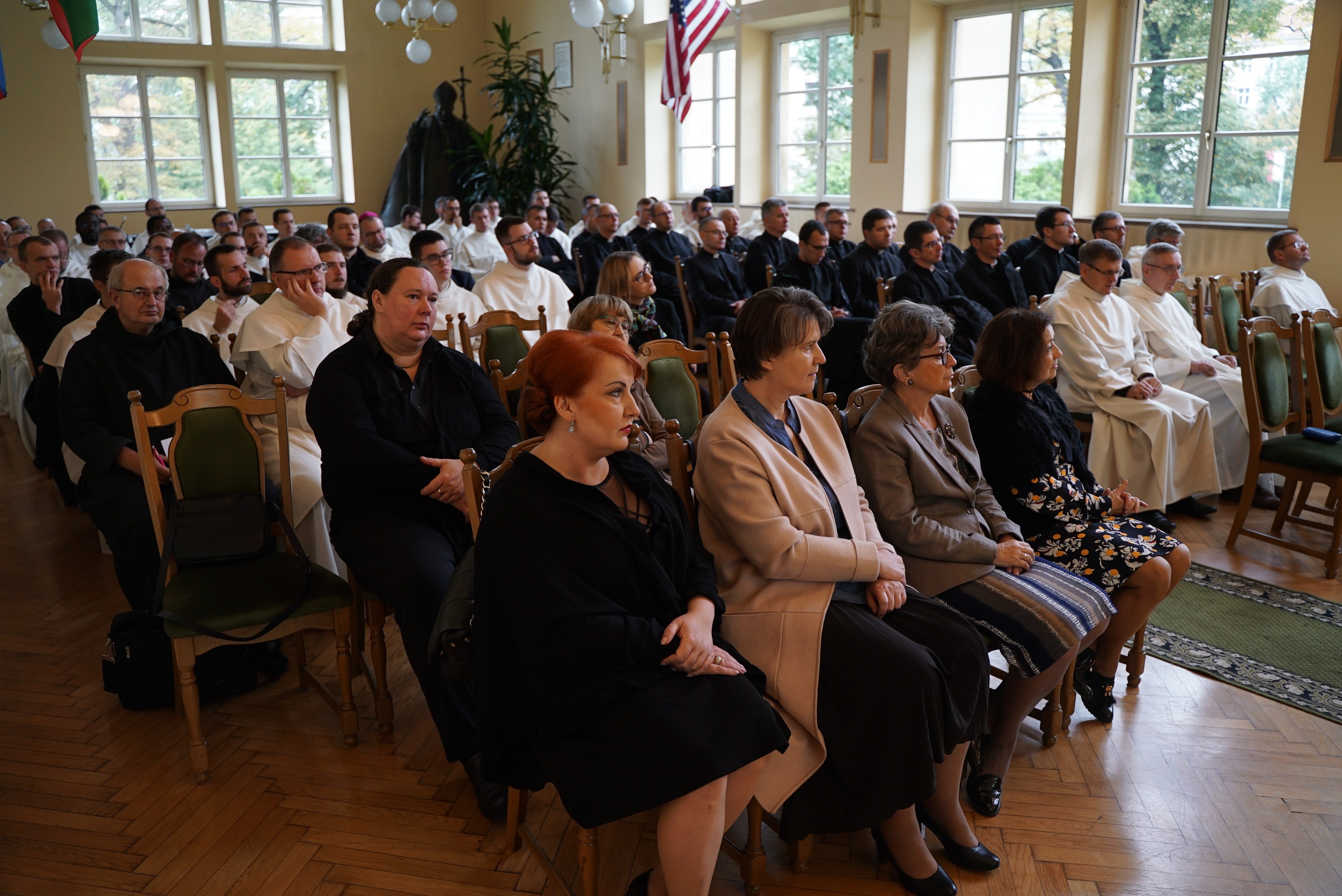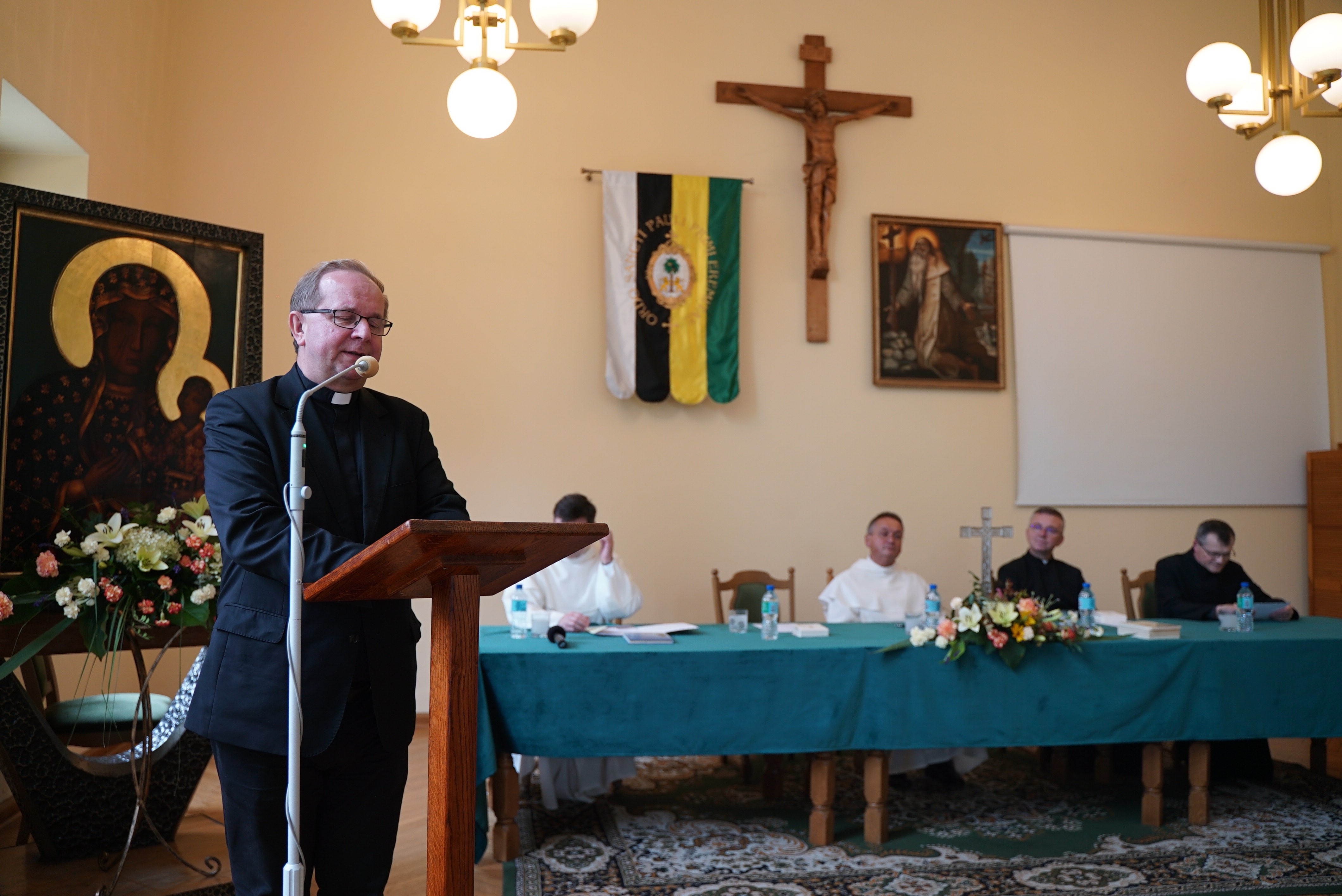 Druga część wydarzenia miała miejsce w auli Wyższego Seminarium Duchownego oo. Paulinów. Na wstępie odśpiewaliśmy hymn Gaude Mater Polonia, a następnie wysłuchaliśmy przemówienia rektora seminarium skałecznego o. Mariusza Tabulskiego OSPPE oraz wykładu inauguracyjnego zatytułowanego „Dziedzictwo historyczne Paulinów na Skałce, fundacja klasztoru i jego założyciel”, który wygłosił dr hab. Marek Kowalski (UJ).