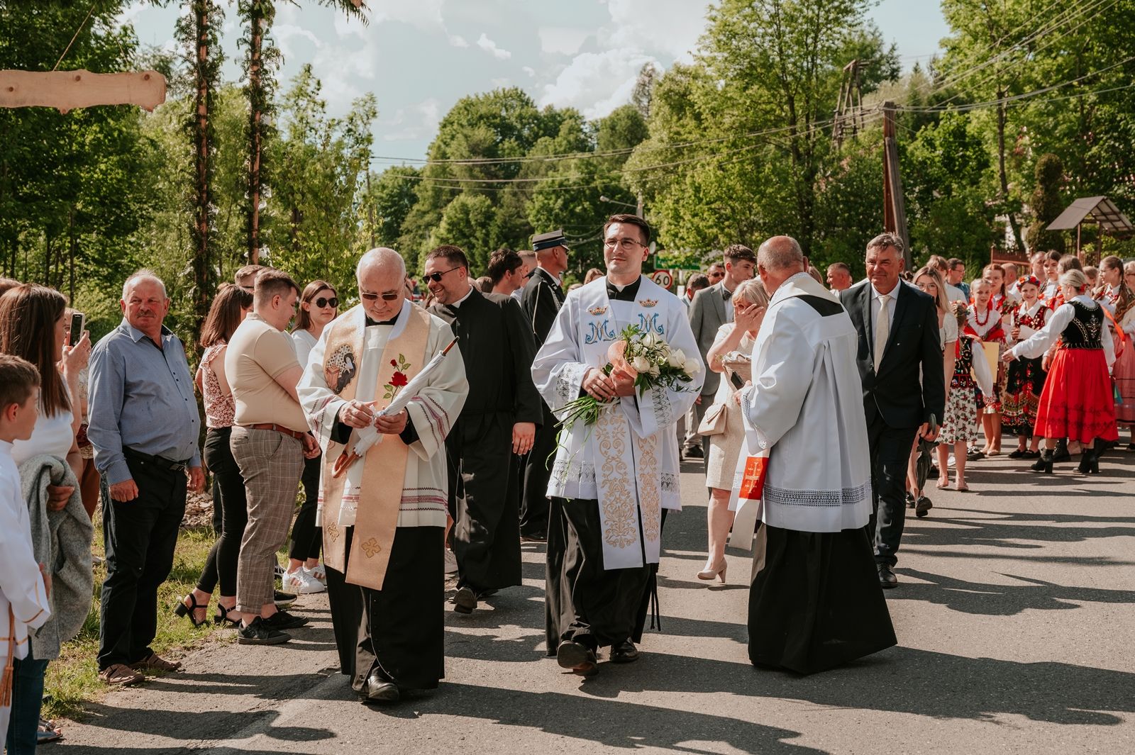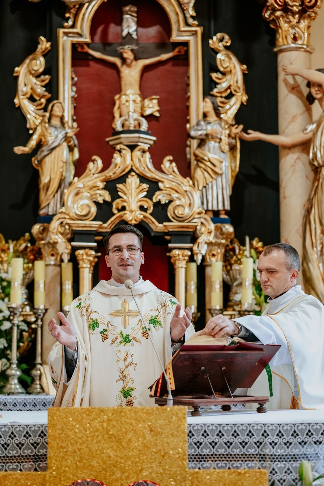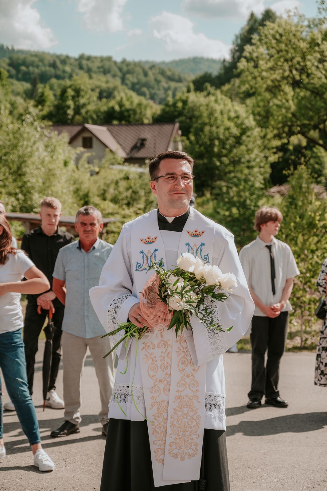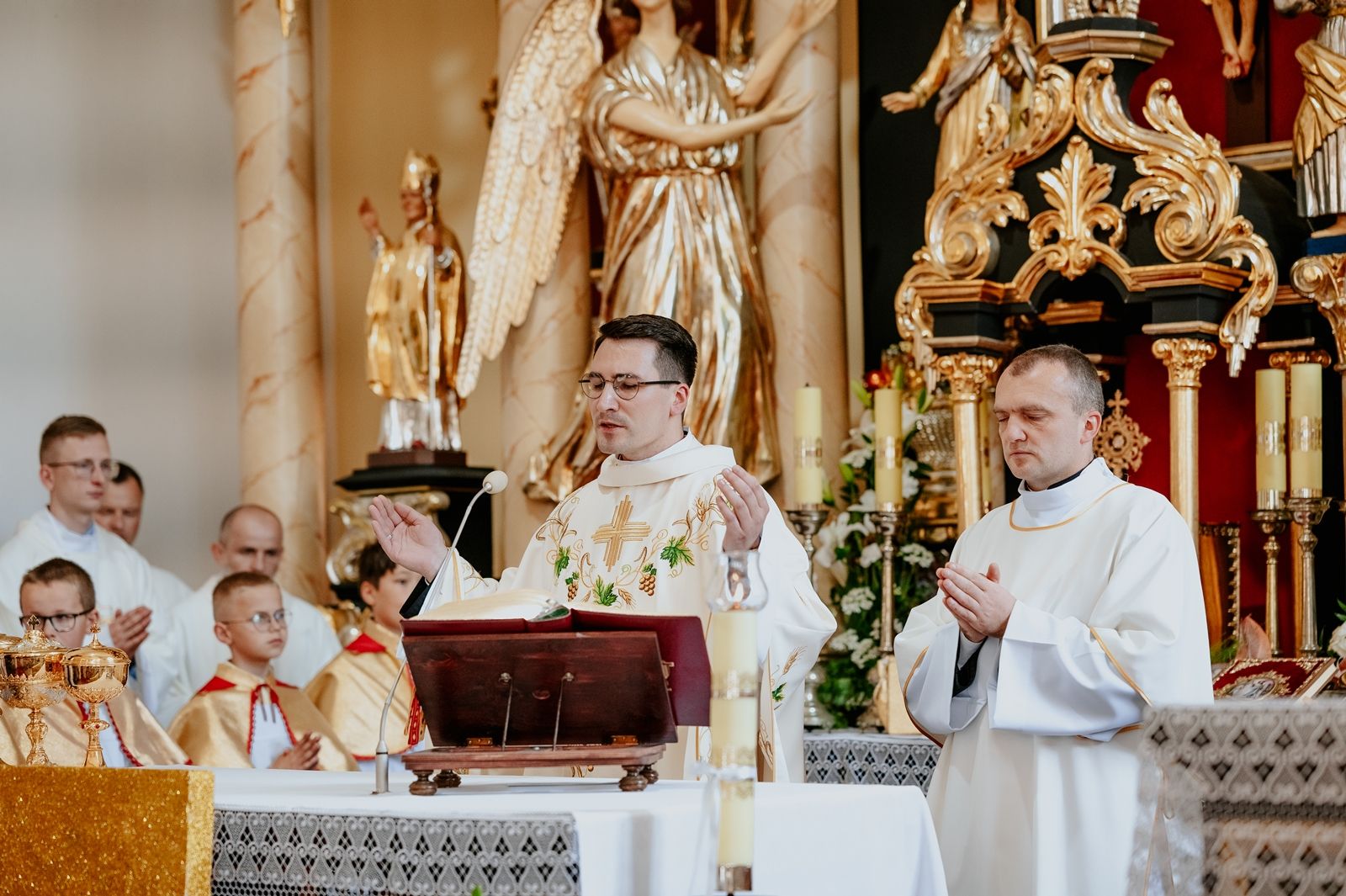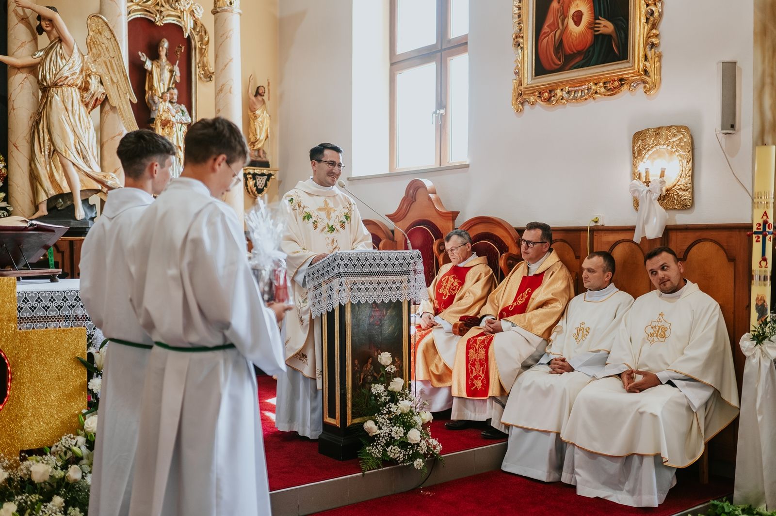 Następnego dnia, wierni zgromadzili się licznie pod domem rodzinnym prymicjanta, w którym rodzice udzielili mu swojego błogosławieństwa. Po tym, wszyscy wyruszyli w stronę kościoła, gdzie o godzinie 11:00 rozpoczęła się Eucharystia prymicyjna, której przewodniczył neoprezbiter. Licznie uczestniczyli w niej księża sercanie oraz znajomi księdzu Mateuszowi kapłani. Okolicznościową homilię wygłosił ks. Damian Płatek SCJ, wieloletni duszpasterz powołań naszej Prowincji, a dziś proboszcz parafii pw. MB Fatimskiej w Krakowie (Małym Płaszowie). Przed zakończeniem Eucharystii liczne grupy parafialne złożyły swojemu rodakowi wzruszające życzenia, zapewniając o nieustannej modlitwie w jego intencji. Po czym, głos zabrał także ks. Mateusz, wyrażając niekryte ogromem doświadczonego dobra poruszenie oraz wdzięczność za organizację tej uroczystości i obecność w jej trakcie.