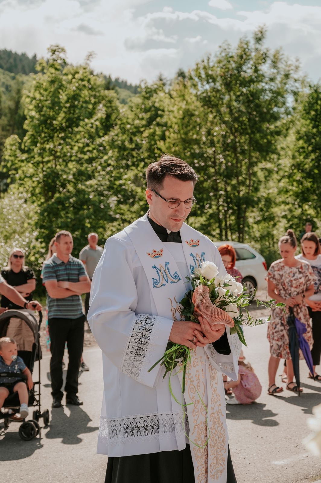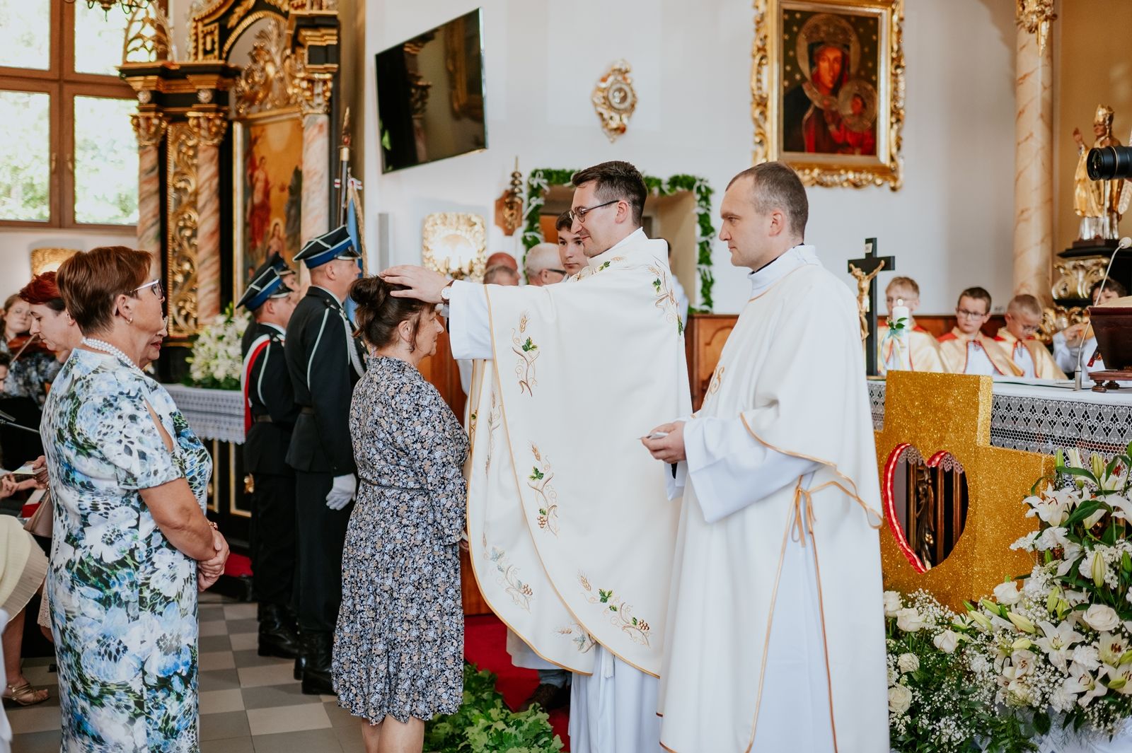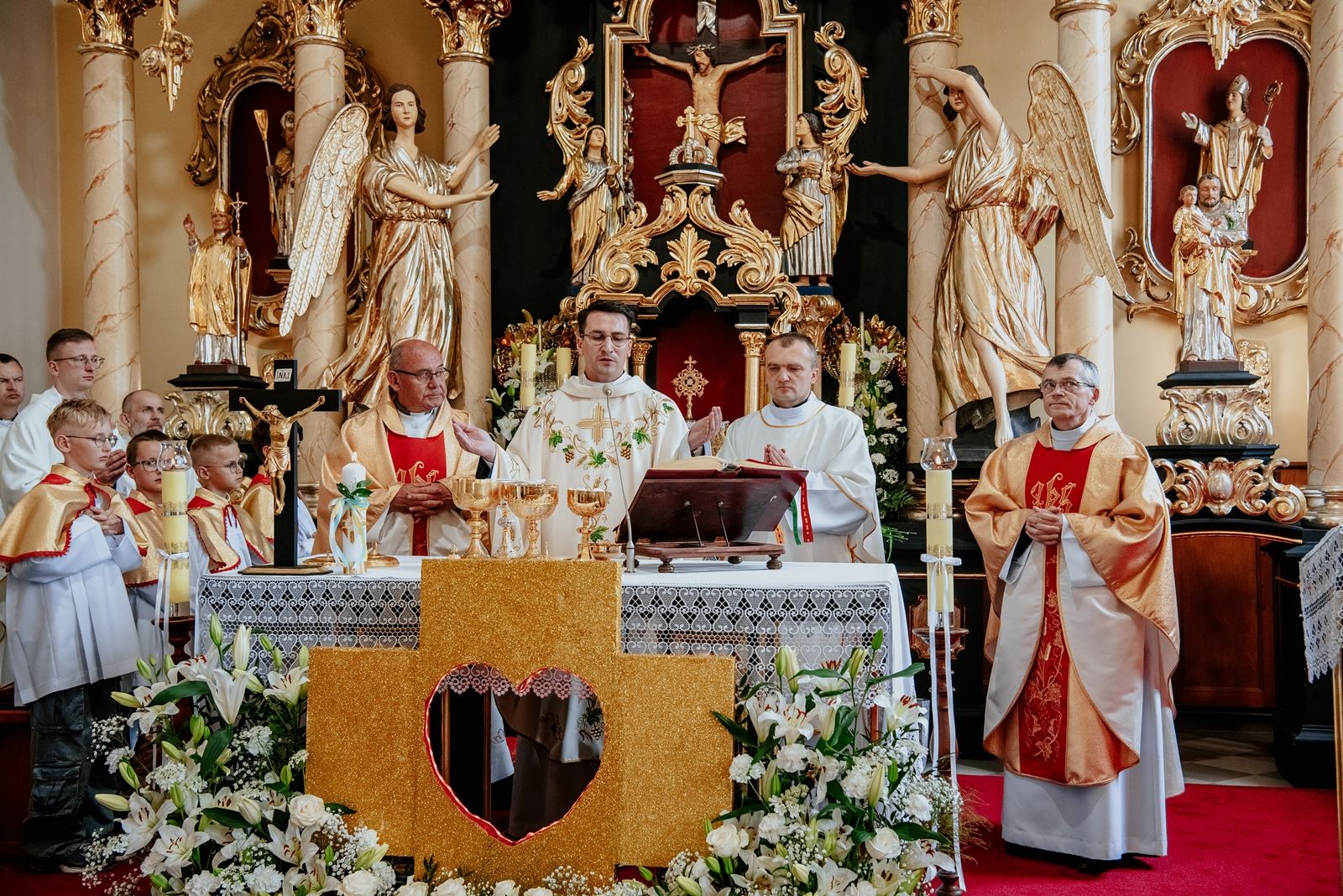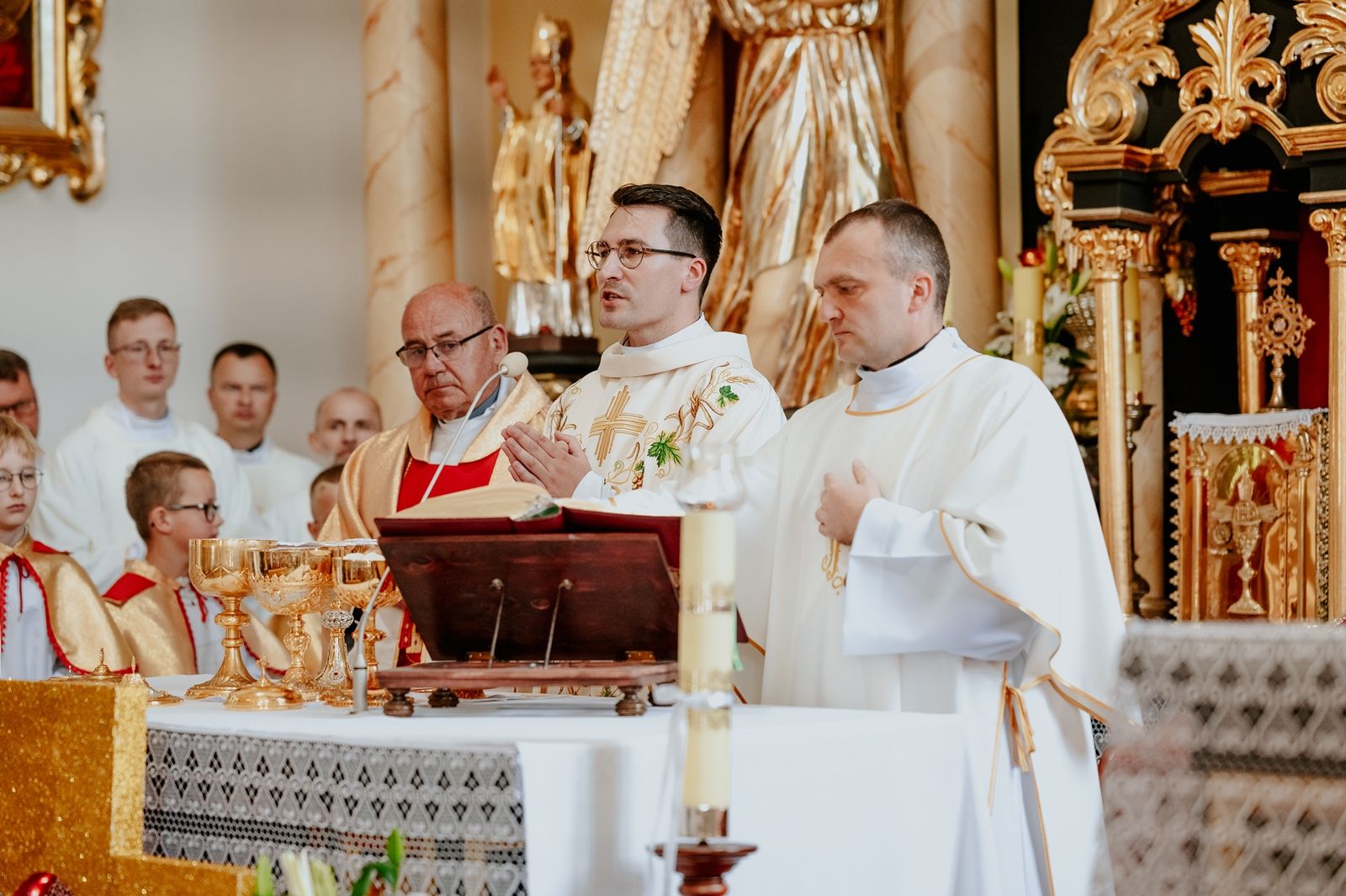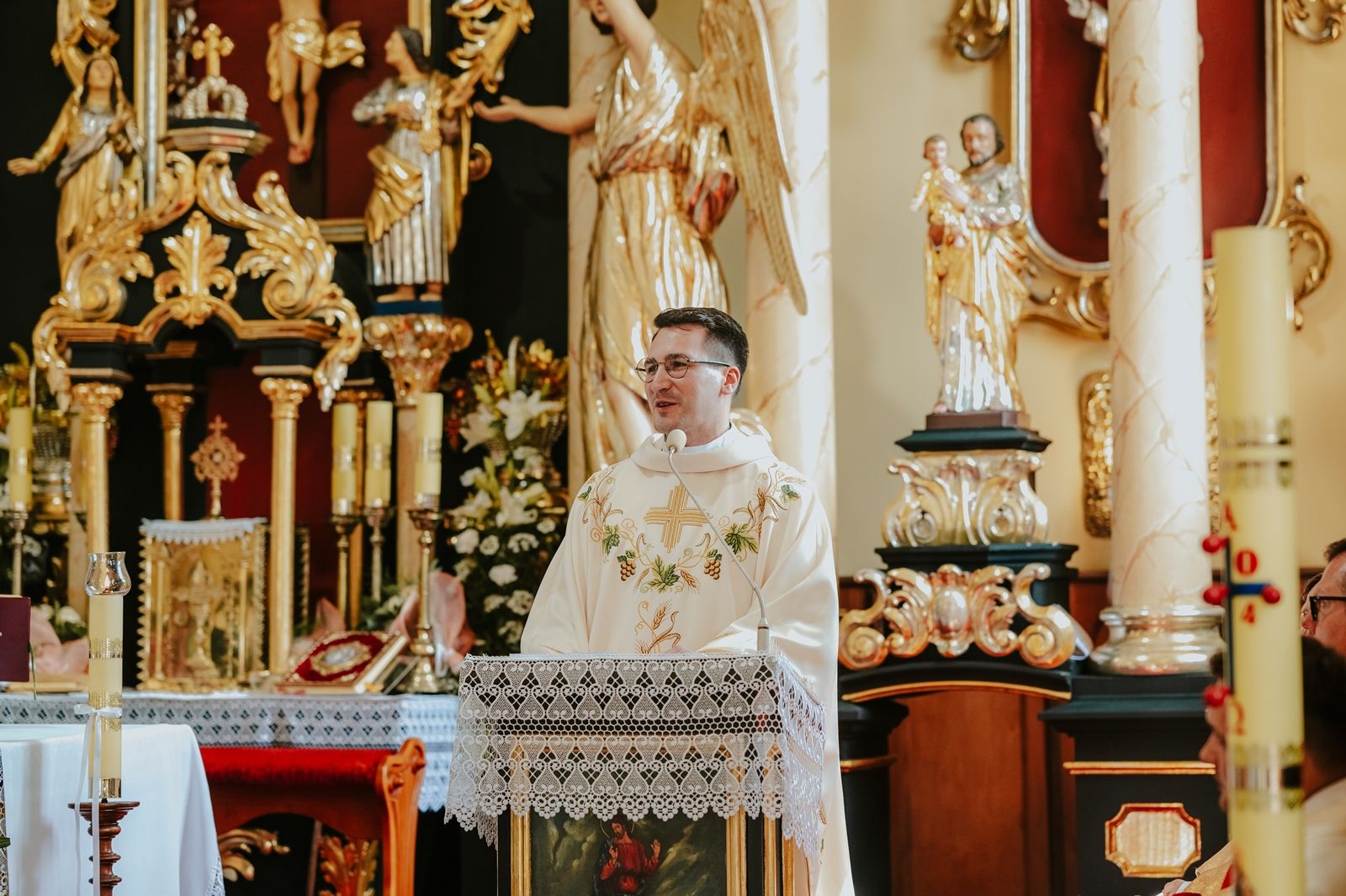 Następnego dnia, wierni zgromadzili się licznie pod domem rodzinnym prymicjanta, w którym rodzice udzielili mu swojego błogosławieństwa. Po tym, wszyscy wyruszyli w stronę kościoła, gdzie o godzinie 11:00 rozpoczęła się Eucharystia prymicyjna, której przewodniczył neoprezbiter. Licznie uczestniczyli w niej księża sercanie oraz znajomi księdzu Mateuszowi kapłani. Okolicznościową homilię wygłosił ks. Damian Płatek SCJ, wieloletni duszpasterz powołań naszej Prowincji, a dziś proboszcz parafii pw. MB Fatimskiej w Krakowie (Małym Płaszowie). Przed zakończeniem Eucharystii liczne grupy parafialne złożyły swojemu rodakowi wzruszające życzenia, zapewniając o nieustannej modlitwie w jego intencji. Po czym, głos zabrał także ks. Mateusz, wyrażając niekryte ogromem doświadczonego dobra poruszenie oraz wdzięczność za organizację tej uroczystości i obecność w jej trakcie.