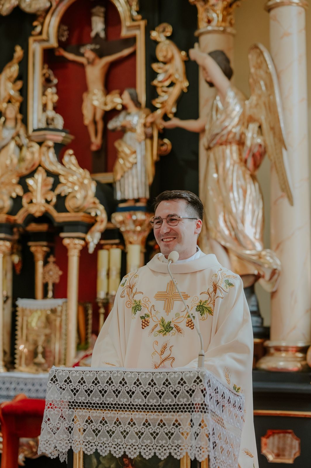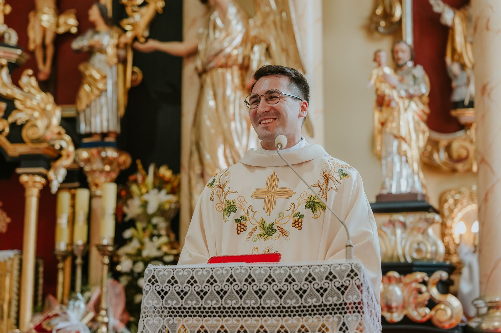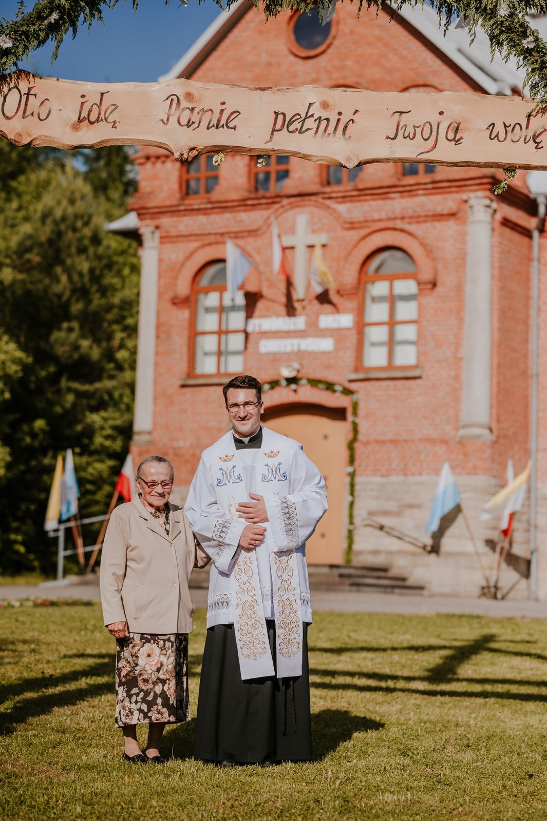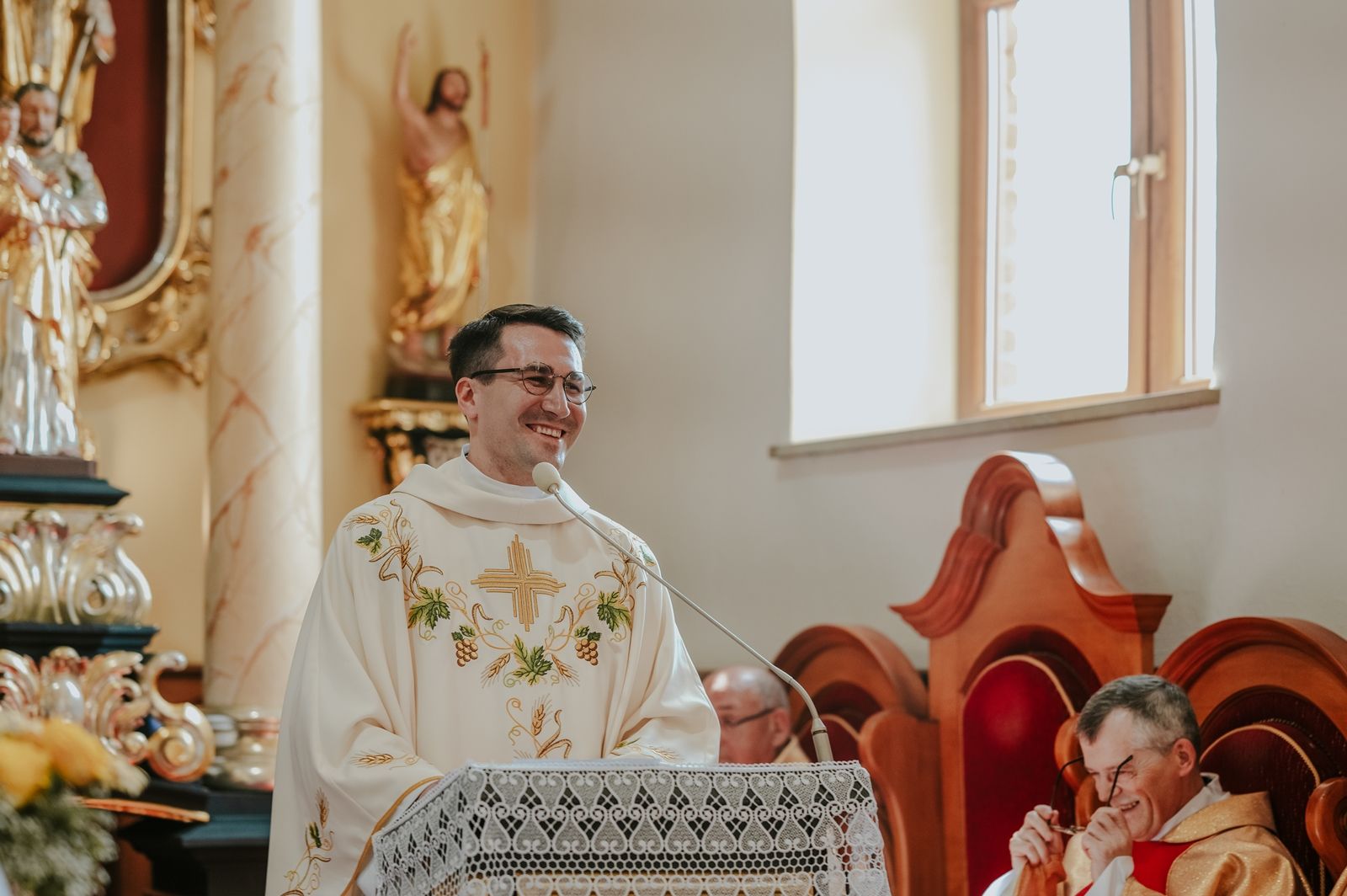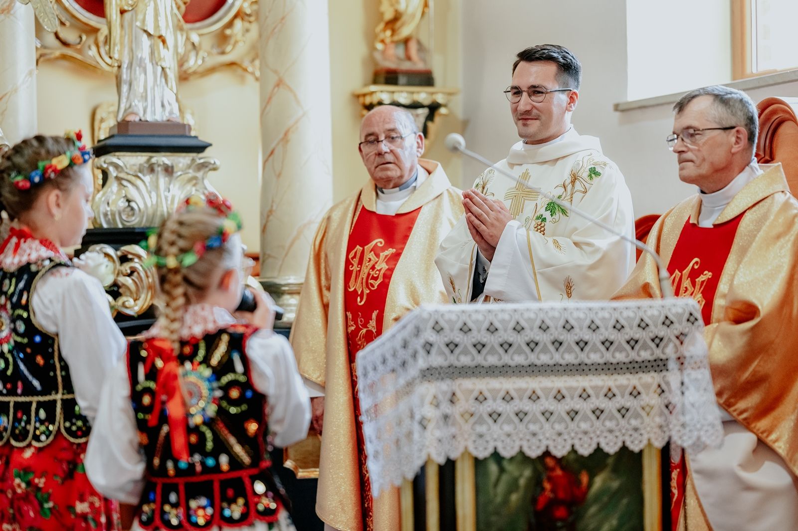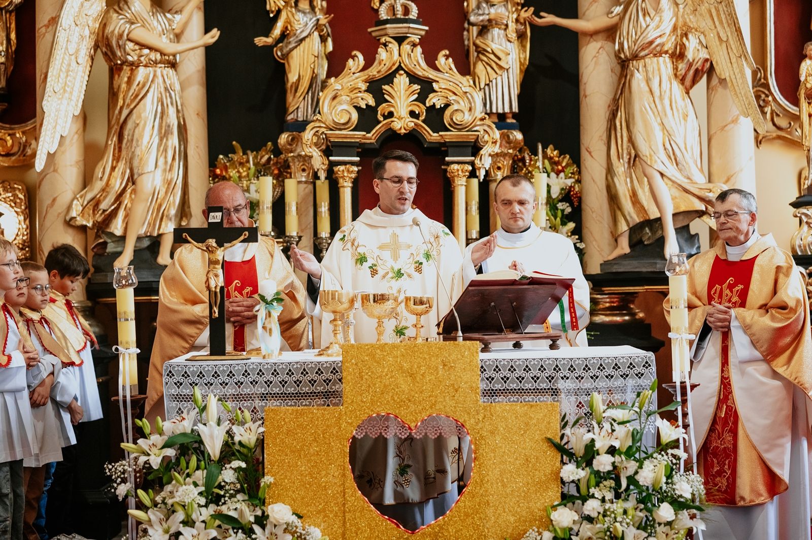Następnego dnia, wierni zgromadzili się licznie pod domem rodzinnym prymicjanta, w którym rodzice udzielili mu swojego błogosławieństwa. Po tym, wszyscy wyruszyli w stronę kościoła, gdzie o godzinie 11:00 rozpoczęła się Eucharystia prymicyjna, której przewodniczył neoprezbiter. Licznie uczestniczyli w niej księża sercanie oraz znajomi księdzu Mateuszowi kapłani. Okolicznościową homilię wygłosił ks. Damian Płatek SCJ, wieloletni duszpasterz powołań naszej Prowincji, a dziś proboszcz parafii pw. MB Fatimskiej w Krakowie (Małym Płaszowie). Przed zakończeniem Eucharystii liczne grupy parafialne złożyły swojemu rodakowi wzruszające życzenia, zapewniając o nieustannej modlitwie w jego intencji. Po czym, głos zabrał także ks. Mateusz, wyrażając niekryte ogromem doświadczonego dobra poruszenie oraz wdzięczność za organizację tej uroczystości i obecność w jej trakcie.