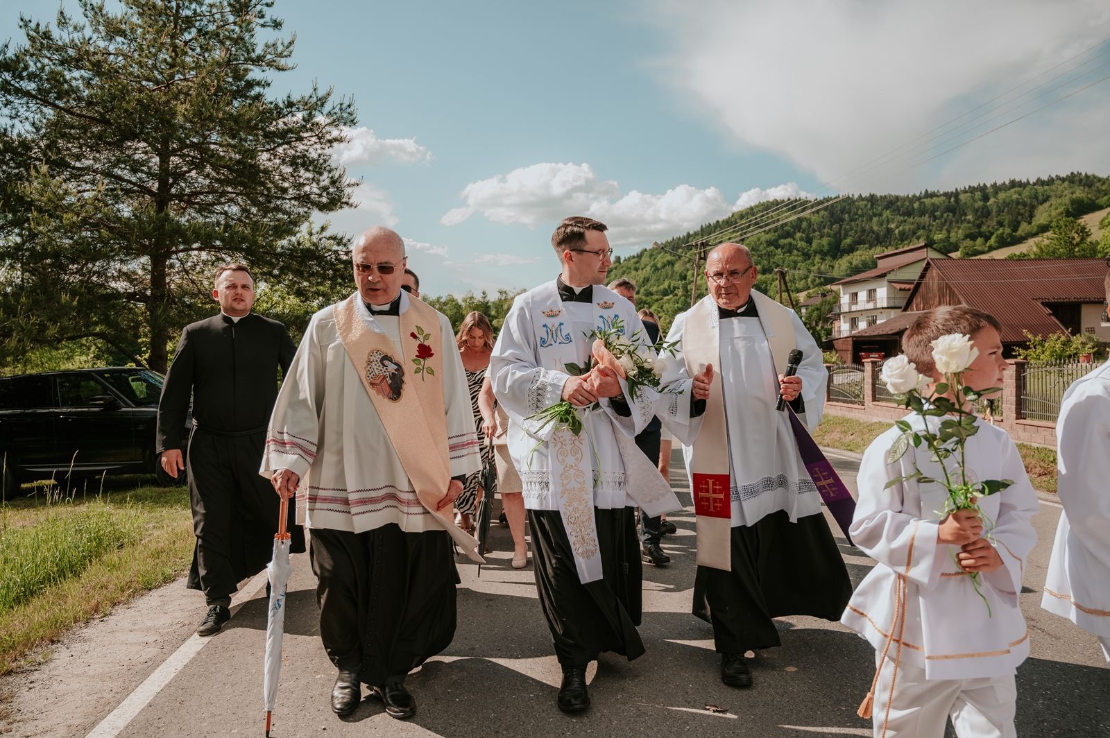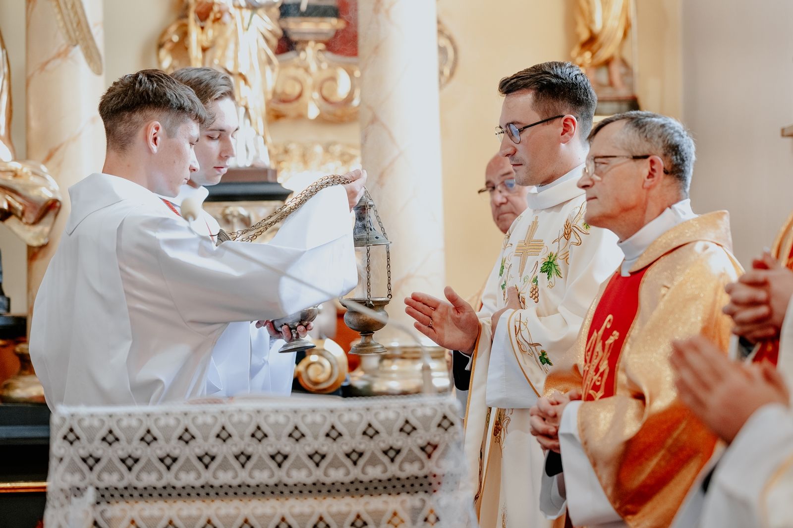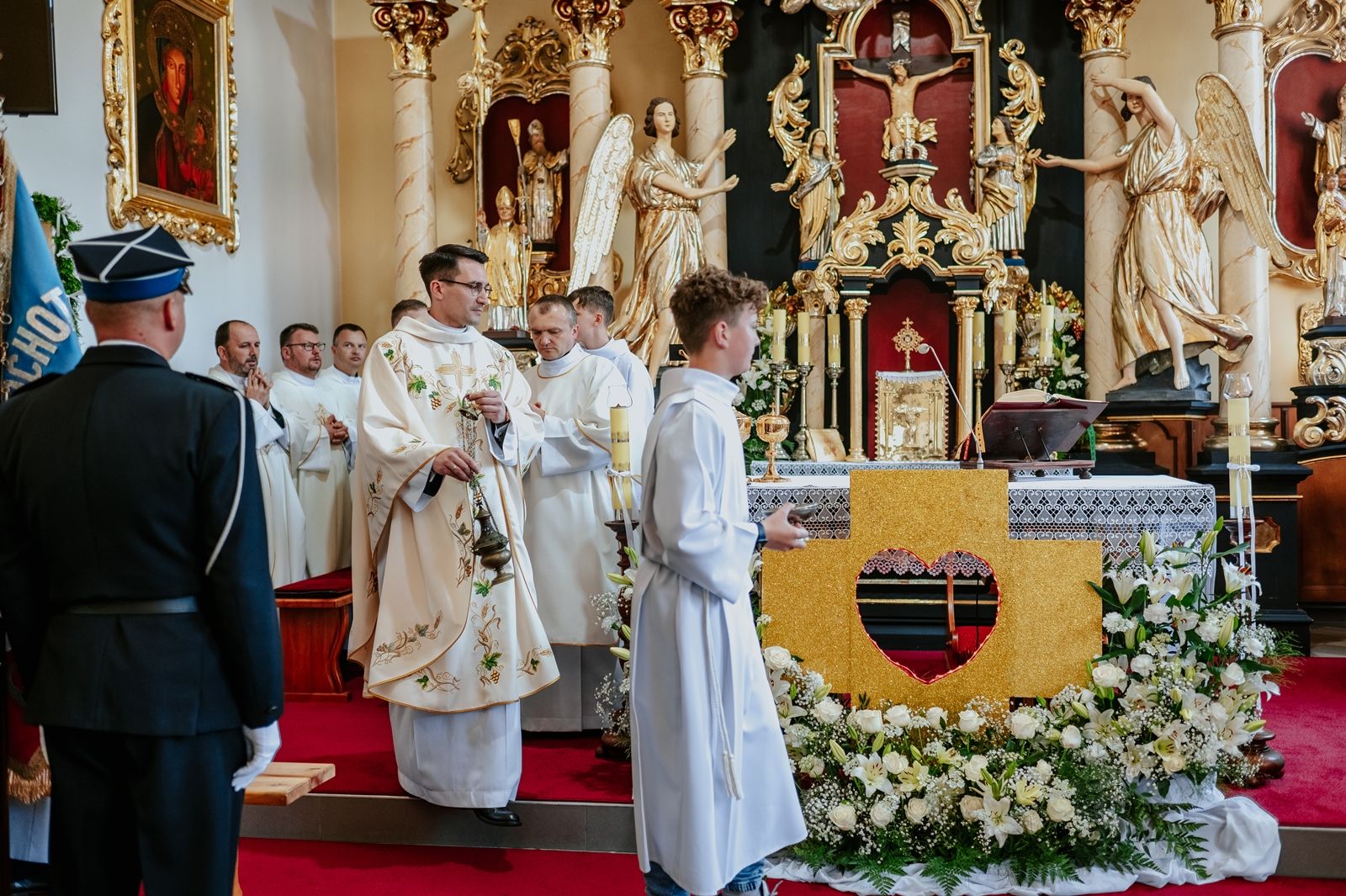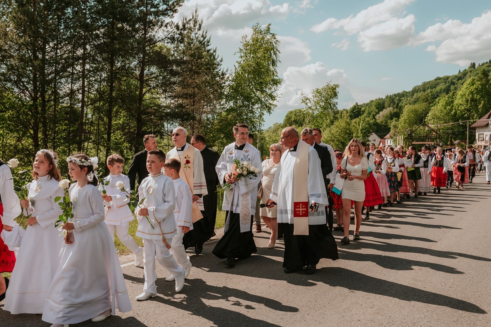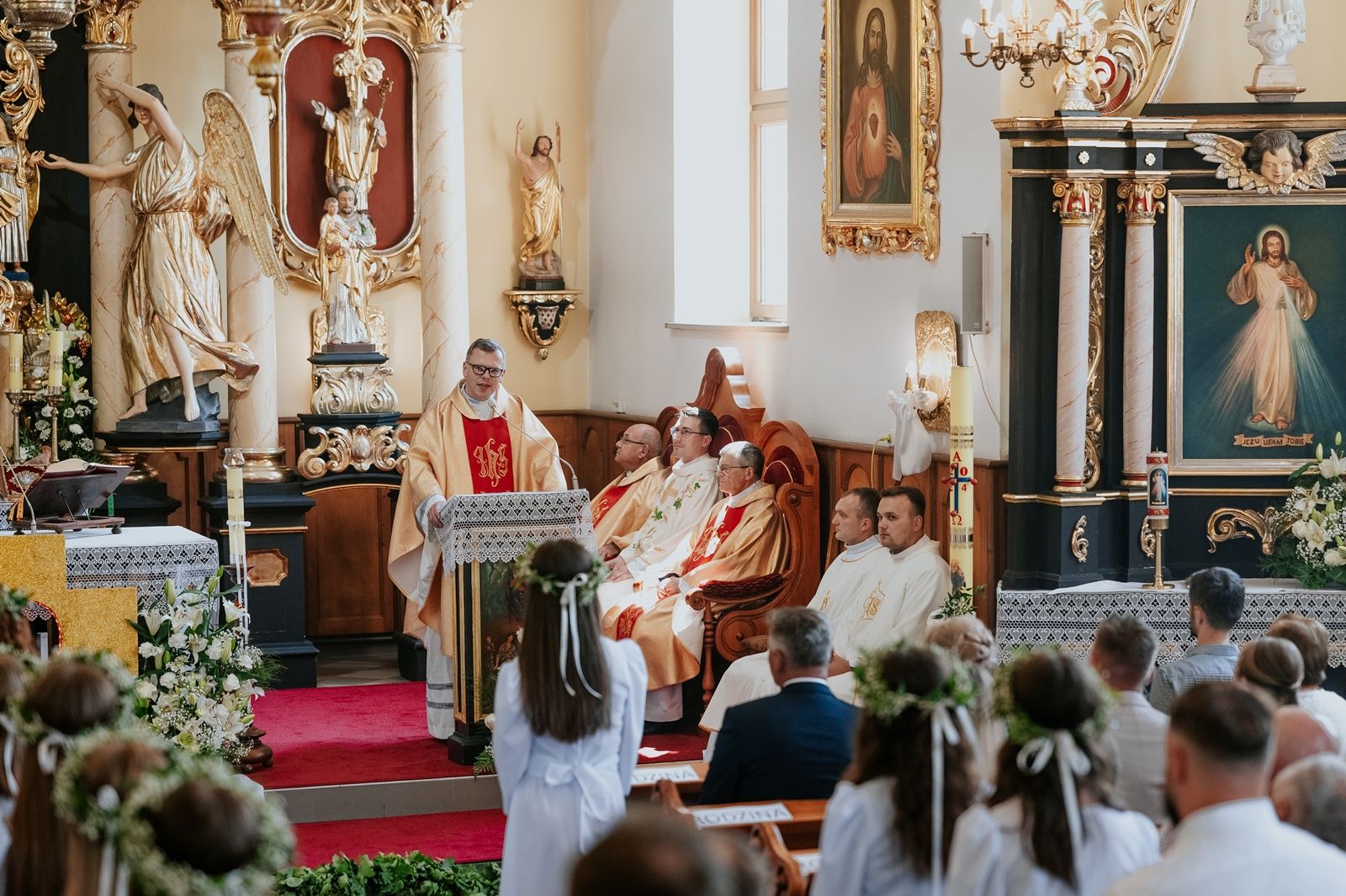 Następnego dnia, wierni zgromadzili się licznie pod domem rodzinnym prymicjanta, w którym rodzice udzielili mu swojego błogosławieństwa. Po tym, wszyscy wyruszyli w stronę kościoła, gdzie o godzinie 11:00 rozpoczęła się Eucharystia prymicyjna, której przewodniczył neoprezbiter. Licznie uczestniczyli w niej księża sercanie oraz znajomi księdzu Mateuszowi kapłani. Okolicznościową homilię wygłosił ks. Damian Płatek SCJ, wieloletni duszpasterz powołań naszej Prowincji, a dziś proboszcz parafii pw. MB Fatimskiej w Krakowie (Małym Płaszowie). Przed zakończeniem Eucharystii liczne grupy parafialne złożyły swojemu rodakowi wzruszające życzenia, zapewniając o nieustannej modlitwie w jego intencji. Po czym, głos zabrał także ks. Mateusz, wyrażając niekryte ogromem doświadczonego dobra poruszenie oraz wdzięczność za organizację tej uroczystości i obecność w jej trakcie.