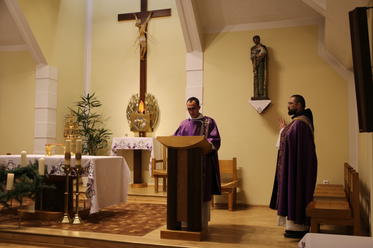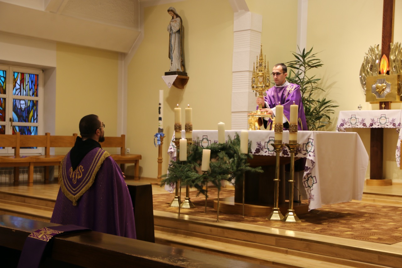 O godzinie 12:00 w kaplicy seminaryjnej zgromadziliśmy się na Eucharystii kończącej grudniowe odnowienie miesięczne. W homilii o. Jan po raz kolejny skoncentrował się na konieczności dążenia do życia zjednoczonego z Bogiem. Tym razem zaznaczył, że w sakramencie chrztu świętego, rodzi się do prawdziwego życia nowy człowiek, natomiast starego człowieka, który jest niewolnikiem grzechu, trzeba ukrzyżować. Do tego celu dąży się przez całe życie, tocząc trudną walkę duchową, do której inspiruje nas Najświętsza Ofiara. Właśnie w niej, Chrystus dając siebie samego w ofierze, pokonuje grzech, czyli starego człowieka.